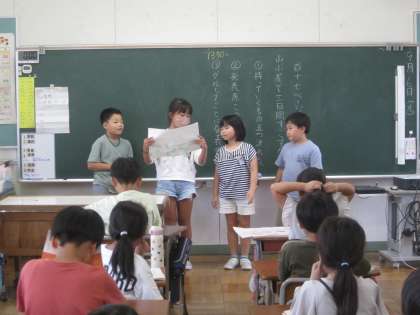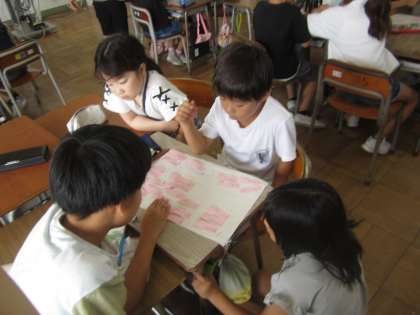国語では、「山小屋で三日間過ごすなら、何を持っていく?」という題材で、グループで持っていく物を5つまで決める話し合いをしています。「ゲームも持って行きたいけど、普段できないことをやりたいよね!」「夜にトランプで楽しみたい!」と、それぞれの考えに共感しながら、話し合いを進めていました。