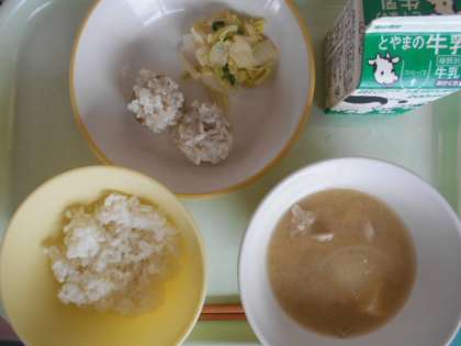 今日の献立は、ご飯、珍珠丸子(ちんじゅわんず)、コーン和え、さつま汁、牛乳 です。