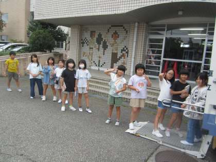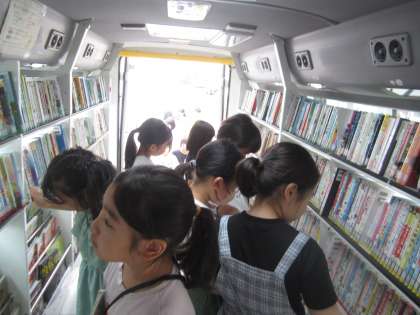 今日は、2学期初の自動車文庫の日でした。久しぶりの自動車文庫に大盛況で、長い列になっていました。あらすじを見て、本を選んでいる人もいましたよ。