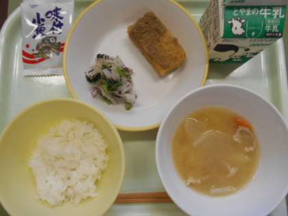 今日の献立は、ご飯、揚げ出し豆腐のごまだれかけ、ゆかりあえ、豚汁、味付け小魚、牛乳 です。