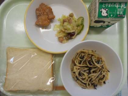 今日の献立は、食パン、照り焼きチキン、ビーンズサラダ、ベーコンとひじきの和風スパゲッティ、牛乳 です。