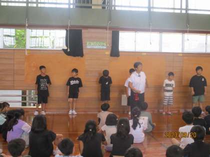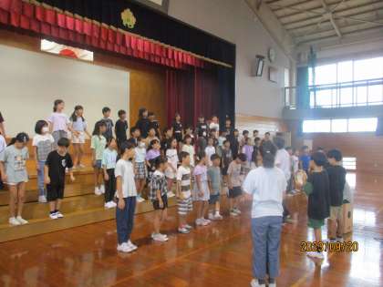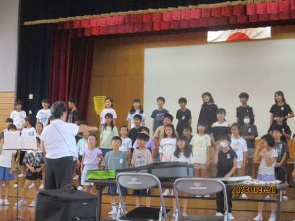 4年生:音楽会に向けて黒田先生の合唱指導:9月20日(水) 公開日 2023/09/20 更新日 2023/09/20 4年生の部屋 2週間ぶりに黒田先生とお会いして、合唱についてたくさんのアドバイスをいただきました。「曲に変化をつけよう」と教えていただき、打楽器で演奏したり、ステップを踏みながら歌ったりしました。最後には体育館いっぱいに広がり、横の人と距離を空けた状態で歌ってみました。離れていても一人一人がしっかり歌う強い心をもってこれからの練習に励んでいきます。