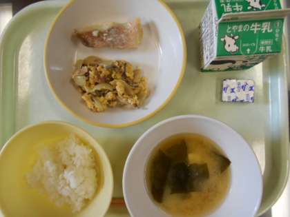 今日の献立は、ご飯、赤魚の塩焼き、卵ときくらげの炒め物、みそ汁、ポケットチーズ、