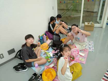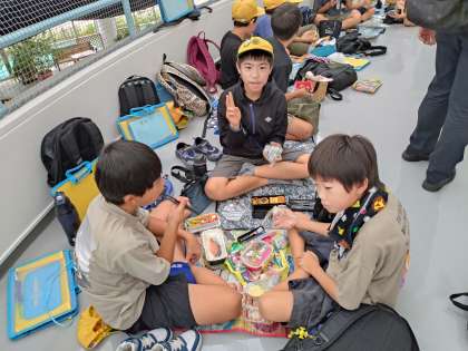 お弁当タイムです。残念ながら小雨が降っているので、室内で食べています。