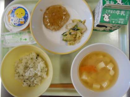 今日の献立は、菜めし、鶏つくねのあんかけ、おひたし、白玉汁、お月見ゼリー、牛乳 です。