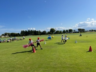 運動会に向けて、中学年種目である「台風の目」の練習を陸上競技場のサブ競技場で行いました。素晴らしい天候の下、芝生の上を気持ちよく走り回りました。