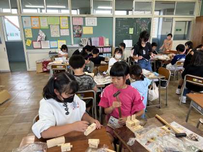 図画工作科の学習では、金槌で釘を打つ学習をしています。