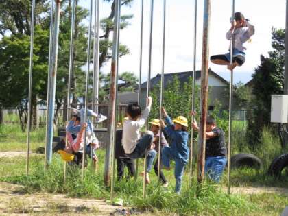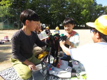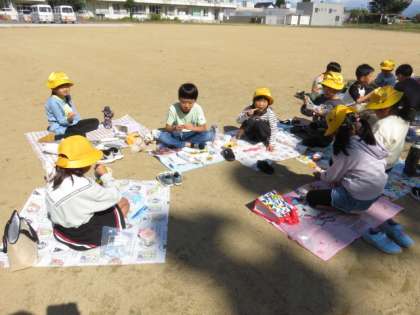 天気がよかったので、グラウンドでお弁当を食べました。風が吹いて気持ちよかったです。水筒を持って乾杯したり、大きなアリが敷物の上ってきて大騒ぎをしながら食べたり、楽しいひとときでした。食べ終わったらグラウンドや新保の森で遊びました。