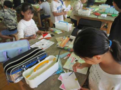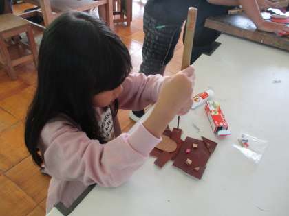 図工では、のこぎりで板を切りそれを組み合わせて楽しく使える物をつくっています。色を塗ったり、ペン立てを作ったり、かぎをかけられるようにくぎを打ったり、自分のつくりたいものを描きながら活動しました。