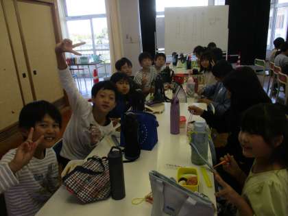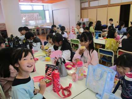 今日はより一層お昼の時間が楽しみだったようです。4年生はランチルームで団ごとにお弁当を食べました。いつもは一緒に食べることのない1組と2組で交流しながら食べました。