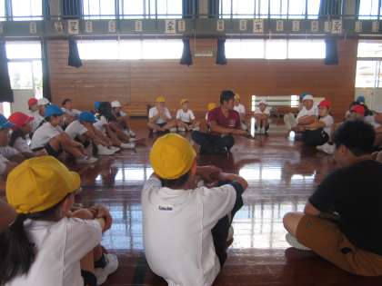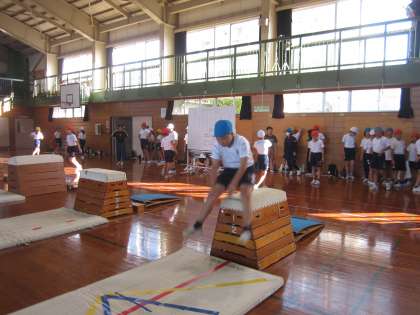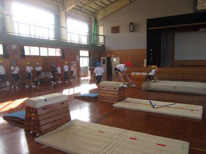 マット運動に続いて、跳び箱運動に挑戦しています。今は、踏み切りを意識して跳ぶことを頑張っています。