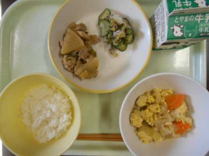 今日の献立は、ご飯、あっさりチキン、ゆかり和え、たまごとじ、牛乳 です。
