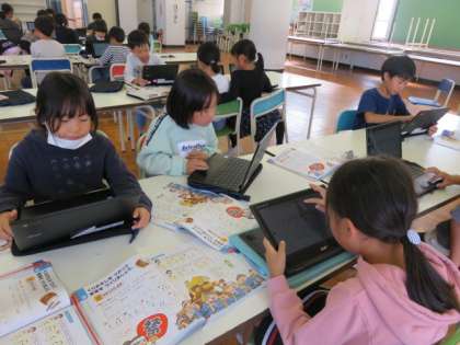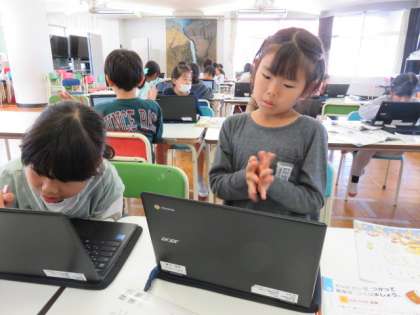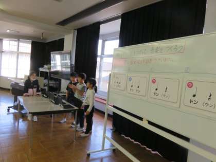 2年生:音楽科「お祭りの音楽」:10月19日(木) 公開日 2023/10/19 更新日 2023/10/19 2年生の部屋 6種類のリズムを組み合わせて、4小節の音楽をつくりました。 クロームブックの作業シートを活用し、いろいろなリズムパターンを作ります。「ドンドコ スコドン・・・」など、4分音符や8分音符を太鼓の音に言い換えながら手拍子を打ち、できた音楽を確かめていました。つくった「おまつりの音楽」を発表し、聴いたり一緒に手拍子をしたりして楽しみました。