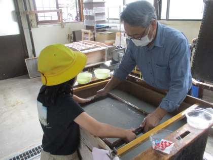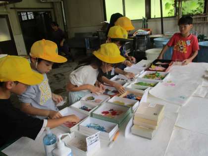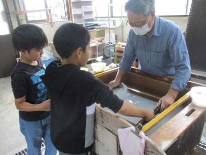 4年生:紙すき体験2:10月20日(金) 公開日 2023/10/20 更新日 2023/10/20 4年生の部屋 飾りを選ぶときには「秋の色合いを意識したよ」「八尾の思い出になるようにおわらの切り紙を選ぼう」とわくわくしていました。実際に紙すきをやってみると「重たいな」「難しい」と苦戦しながらもたくさん助けていただき、すてきな和紙ができあがりました。来週家に持ち帰るので、ぜひご覧ください。