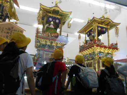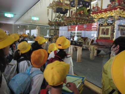 4年生:曳山展示館:10月20日(金) 公開日 2023/10/20 更新日 2023/10/20 4年生の部屋 最後は曳山展示館に行きました。実際の曳山の大きさは約7メートル半、重さ約4トンだそうです。細部の飾り、神様、それぞれの曳山の特徴を教えていただき、「写真で見るよりすごい!」と感動していた4年生です。蚕の展示室も見せていただき、蚕によって栄えてきた八尾の歴史、人々が受け継ぐ思い等を肌で感じ、たくさんの学びを得ることができた校外学習になりました。
