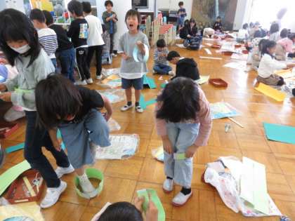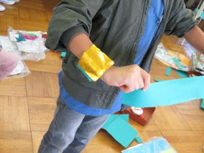 2年生:わっかで へんしん:10月27日(金) 公開日 2023/10/30 更新日 2023/10/30 2年生の部屋 学習発表会のグループのイメージカラーの色画用紙で、衣装を作りました。子供たちは、衣装を作るのを楽しみにしていました。腰や手首、胴等のサイズに合わせて輪っかを作って、その輪っかに飾りを付けていきます。グループの友達と協力したり見せ合ったりしながら作りました。