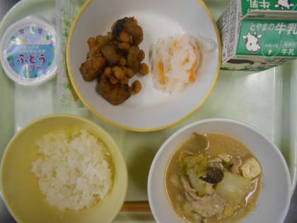 今日の献立は「学校給食とやまの日」の特別献立で、ご飯、魚と大豆のえごまからめ、おすわい、とやまのみそ野菜鍋、海洋深層水ゼリー、牛乳 です。