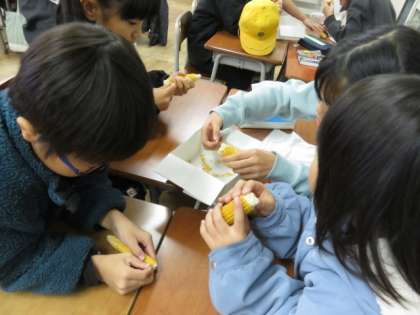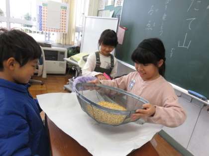 2年生:ポップコーンの実:11月30日(木) 公開日 2023/11/30 更新日 2023/11/30 2年生の部屋 9月に収穫し、教室で乾燥していたポップコーンの実を一粒ずつ取りました。「指が痛い」と訴える子供もいて、手作業の大変さを実感していました。床に落ちてしまったコーンも見逃さず大切にし、一つにまとめて、ザルで細かな皮も取り除きました。 子供たちは「マラカスみたい」と、乾いた豆の音を楽しんでいました。 学期末の収穫祭でポップコーンを作って、みんなでいただきたいと思います。