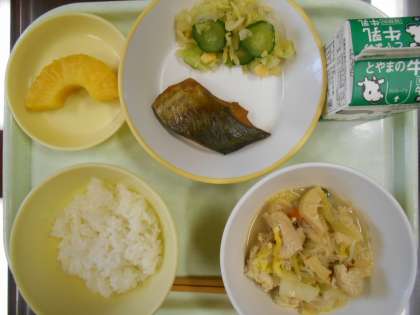 今日の献立は、ご飯、アジのみりん焼き、コーン和え、鶏すき焼き、パイナップル、牛乳 です。