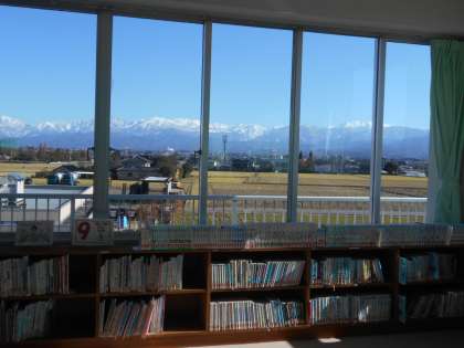 よく晴れた冬の日は、グラウンドや3階の図書室から、雪の立山連峰がすっきりと見えます。特に、図書室から見える景色は、新保小の自慢のひとつです。