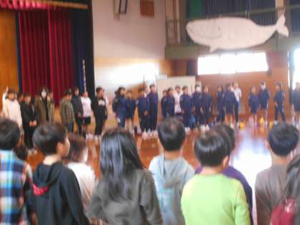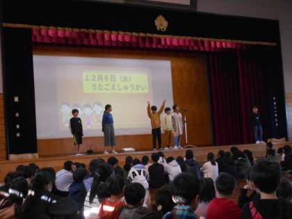 4年生が、高学年や縦割り班のメンバーなどに、これまで言えていなかった「ありがとう」をマイクを通して伝え、その後、みんなで、今月の歌「ありがとうの花」を歌いました。