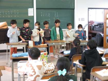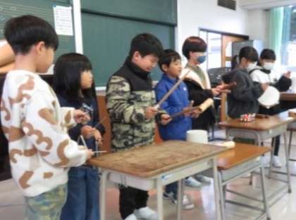 歌に合わせて、カスタネットやウッドブロック等、7種類の打楽器の音を重ねていきます。楽器を交代しながら演奏し、それぞれの音色や組合せによる響きを楽しんでいました。