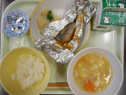 今日の献立は、ご飯、さばの銀紙焼き、かぶの色取り、打ち豆汁、ヨーグルト、牛乳 です。