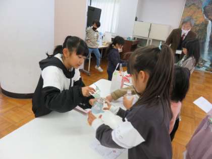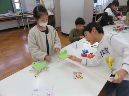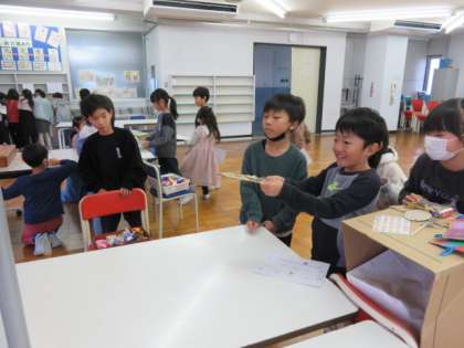 2年生が作った、輪ゴムの力で動くおもちゃを集めた「わゴムランド」へ、1年生を招待しました。2年生は、1年生が来るのをワクワク心待ちにしていました。1年生に遊び方を教えたり、シールや景品を渡したり、自然と関わり合っていました。1年生も遊びを思いっきり楽しんだり、動く仕組みに興味をもったりする姿が見られ、互いに充実した時間となりました。