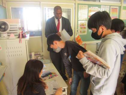 3学期から、ALTの先生がマイク先生になります。今日は、初めての顔合わせの日でした。ムカラム先生とは、2学期末でお別れになります。今日の授業後には、恒例のサイン会をしました。