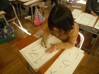 1年生は「みらい」と書きます。初めての書き初めで苦戦しながらも、大きさとかたちに気をつけて練習しています。