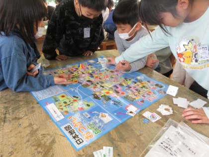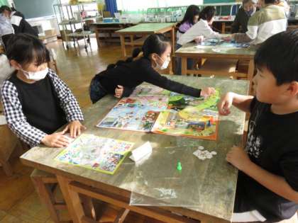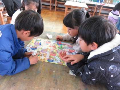 2年生:すごろく:12月20日(火) 公開日 2023/12/19 更新日 2023/12/19 2年生の部屋 生活時間に、お正月の遊びについて話し合った後、すごろくで遊びました。抽選で8つのグループに分かれ、それぞれ違ったコンセプトのすごろくをしました。イベントカードを開いて指示に従ったり、ポイントをもらったりして楽しんでいました。