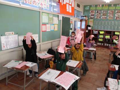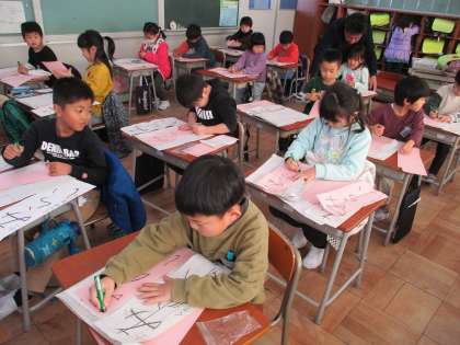書き初め大会では、一文字一文字、丁寧に書いていました。