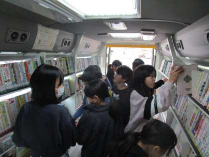 今日は3学期最初の自動車文庫の日でした。習っているスポーツの本やお話の本など、興味のある本を見付けて借りていました。