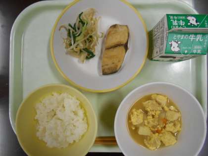 今日の献立は、ご飯、ふくらぎの西京焼き、塩ナムル、厚揚げの錦とじ、牛乳 です。