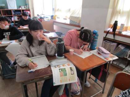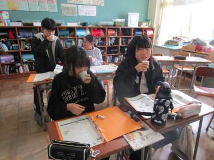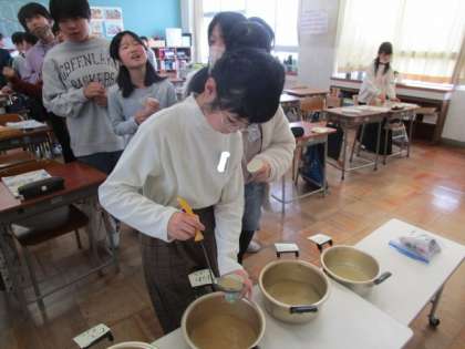 家庭科では、ご飯の炊き方や味噌汁の作り方について学習しています。2月5日(月)「お弁当の日」に調理実習(ご飯・みそ汁)をするのにあわせて、実際に「にぼし」「かつおぶし」「こんぶ」のだし汁を飲み比べてみました。だし汁だけだとあまり味はしないのですが、味噌を入れると美味しく感じたようです。