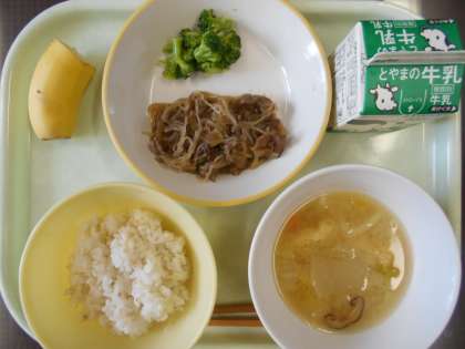 麦ごはん、パワーぎゅうぎゅう丼、ゆでブロッコリー、具だくさん汁、バナナ、牛乳 です。(写真)