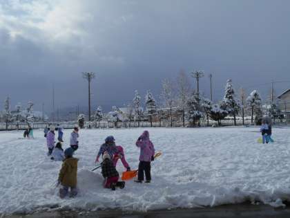 今日はたくさんの子供たちが雪遊びをしにグラウンドに出ていました。雪の中で遊ぶには体力が必要です。しっかり食べて、エネルギー補給しましょう。
