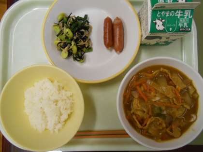 ご飯、鉄たっぷりサラダ、あらびきウインナー、スタミナカレーうどん、牛乳 です。