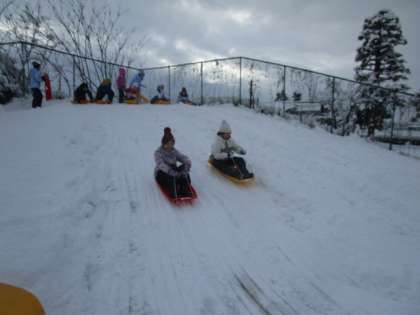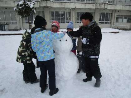 雪が降ったので、外で体育をしました。最初は雪の上でリレーをした後、そりをしたり、雪だるまを作ったりと、思い思いに雪と触れ合いました。ふかふかの雪の上で、思い切り身体を動かすことができました。