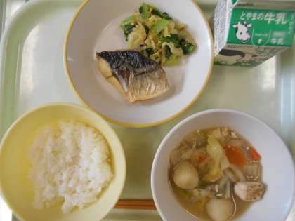 今日の献立は、ご飯、さばの塩焼き、いり大豆和え、ちゃんこ鍋、牛乳 です。