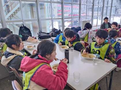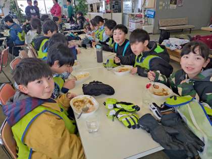 5・6年生は先にお昼ご飯の時間です。カレーライスを食べています。