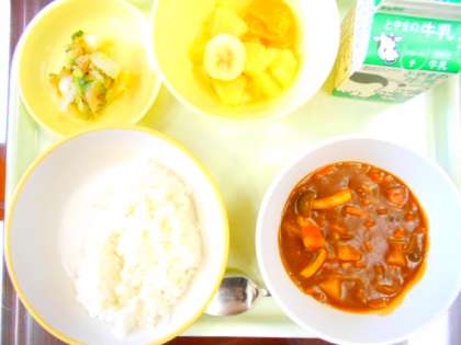 今日の献立は、ご飯、食べキリンハヤシ、福神和え、フルーツミックス、牛乳 です。