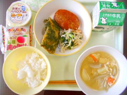 今日は、選択献立の日です。主菜(魚の磯辺揚げorハンバーグのケチャップ煮)と、デザート(もものタルトorみかんババロア)を選んで食べます。その他の献立は、はりはり和え、具だくさん汁、牛乳 です。