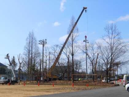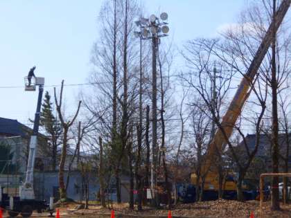 グラウンド西側の「新保の森」の整備が進んでいます。間引いた樹木はチップにして森にまかれます。季節が進んでどんな森になっていくか、楽しみです。