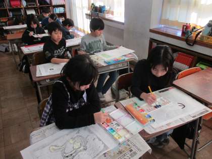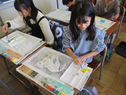 白黒で印刷した後、紙を裏にして水彩で色をつけました。水を多く含んだ絵の具で塗ると、色がはっきりうつりました。仕上がった作品は教室前や階段踊り場に掲示しました。学習参観の際にぜひご覧ください。