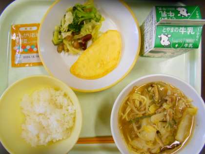 今日の献立は、ご飯、オムレツ、ビーンズサラダ、とんこつラーメン、野菜ふりかけ、牛乳 です。