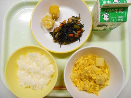 今日の献立は、ご飯、ひじきの炒め煮、にんじんシューマイ、卵とじ 牛乳 です。