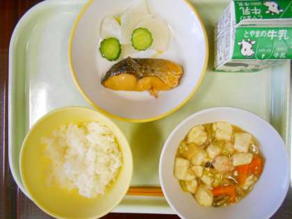 今日の献立は、ご飯、ふくらぎの西京焼き、かぶのサラダ、えびと豆腐のうま煮、牛乳 です。