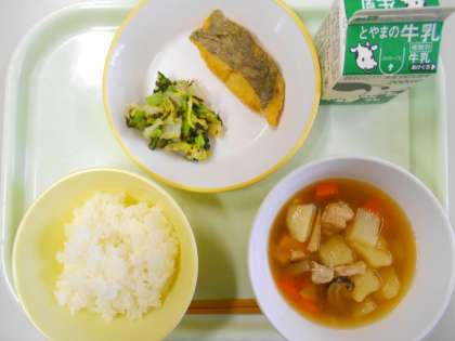 今日の献立は、ご飯、大和煮、いそ和え、揚げざかなのレモン味、牛乳 です。