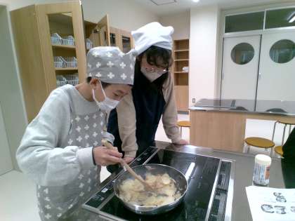 2組の調理実習の様子です。班で手順を確認しながら、手際よく調理していました。